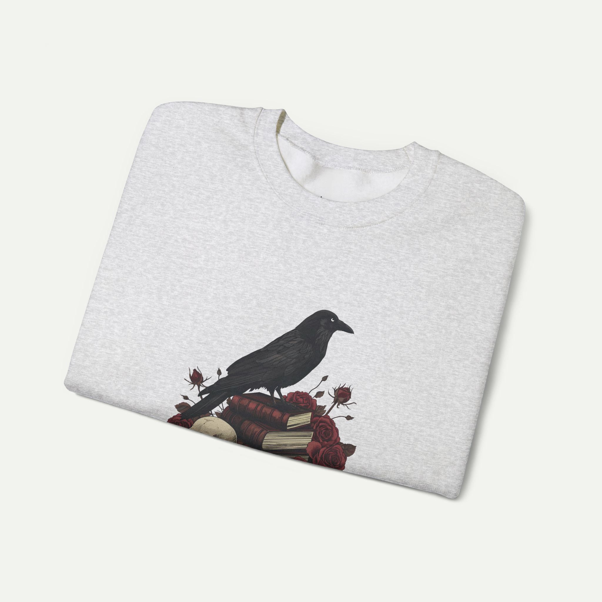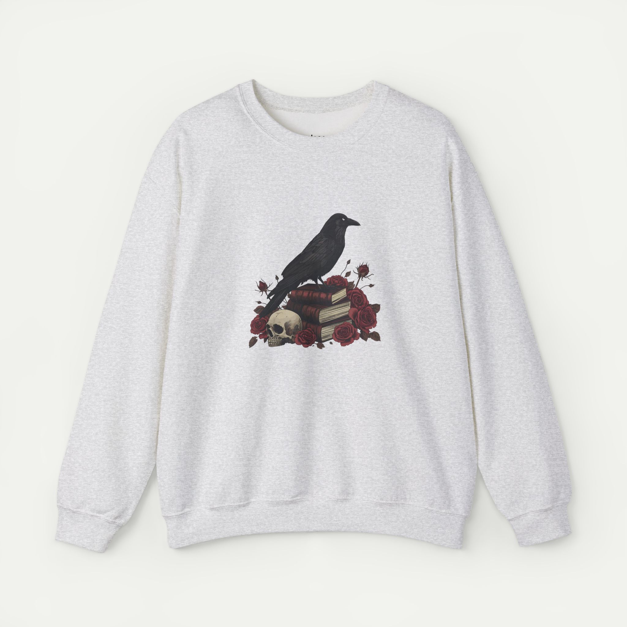 In the depths of an ancient library where time stands still and no footsteps echo, a raven proudly watches over the forgotten tales of the past. Perched atop a pile of books, the stories within hold the love, sorrow, and wisdom once poured from the hearts of humankind. Among the dusty tomes, blooming roses serve as a reminder of both the fleeting beauty of life and the enduring power of memory. Beside them, a skull rests, symbolizing the finality of life and the immortality of stories.